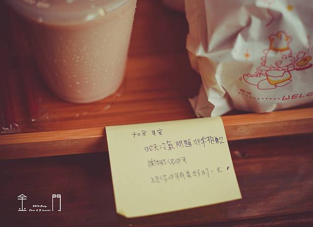 昨天升等的房间后来因为空调故障的缘故,老板又给我们换了一间。起床就看到老板准备的元气早饭和暖暖的便利贴,湾湾人民的善良与礼貌总是无处不在