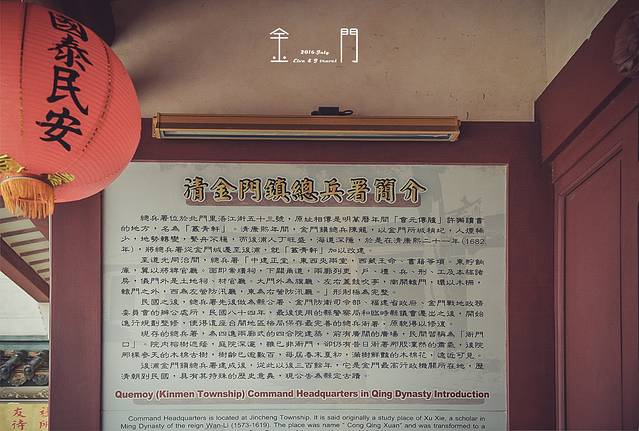 清金门镇总兵署,原本为明代会元许獬的书斋,清康熙年间清兵攻下金门,并将其改建为清兵总署衙门。现存的总兵署为典型的四进式两廊式闽南四合院。室内展示了各式各样衙门总兵署的相关文物以及旧时关押犯人的地下牢房,如果是晚上来,难免背脊发凉