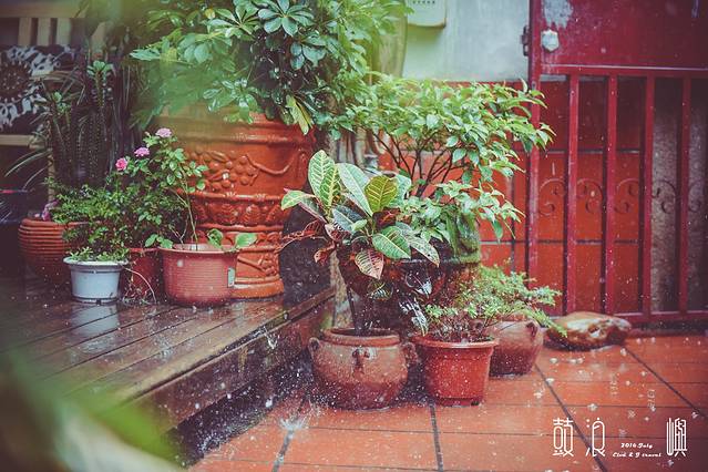 转了一圈回酒店终于可以check in了,老天爷憋不住的下暴雨了,雨天的花草角落居然有点好看