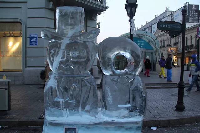 中央大街因为特别的面包砖在全国众多步行街中脱颖而出,两边的的冰雕小巧精致晚上彩灯亮起更是锦上添花,冷风像刺刀刮脸,在如此寒冷的时刻还必须入口一根马迭尔冰棍,那感觉甚是极好的!零下三十度吃冰棒那是一种独特的乐趣!!