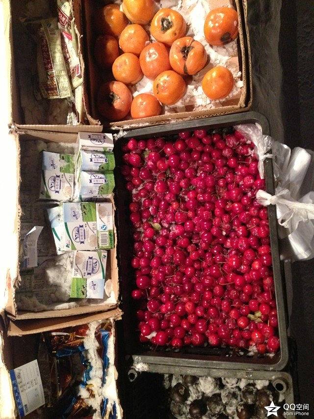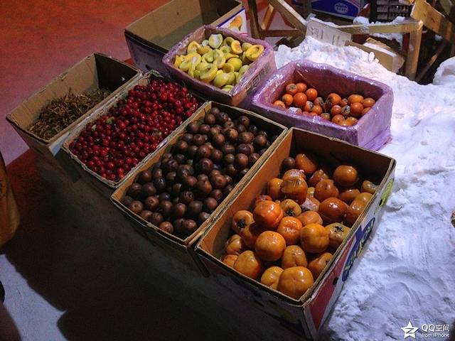 今天天色已晚吃过饭后只有先去闲逛一下,雪乡的唯一的一条主街叫雪韵大街,大约500米长,路两边摆着各种冻梨,冻柿子,冻桃子,还有冰淇淋,天然冰箱,这温度冰箱也省了!