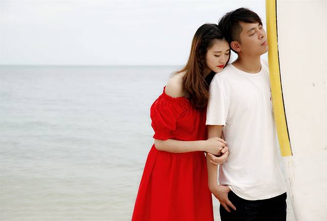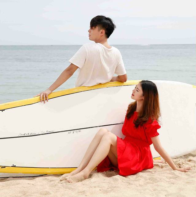 下午3点左右已经开始热得我们都有点晕了,这对小夫妇从早上起来的兴奋开始变得有点疲惫,众所周知拍婚纱不管是对客人还是工作人员而言都是个体力活。这时发现海滩边上有个白色的酒吧,于是大家准备在那喝点冰水,补妆换衣服,歇歇脚,调整下状态继续。