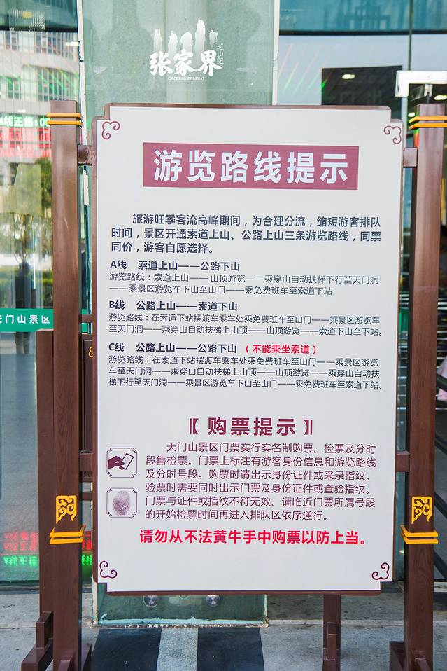 这里要说明的一下是天门山景区总共有三种游玩方式,必须选择其中一种,大部分人一般不是选择A线就是B线,因为天门山的99道弯的盘山公路和落差有1000米高的索道都是非常有特色的。肯定都是要体验下的,但是听阿钟说,旺季人多的时候,有些游客只能选择C线,因为A线和B线的票都卖完了,所以体验不到世界之最的超高落差索道还是有点遗憾的。所以建议大家提前预定,当然我们有向导,省去了这些烦恼,所以一切交给他安排准不会错。