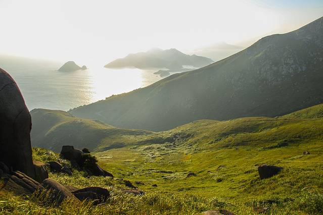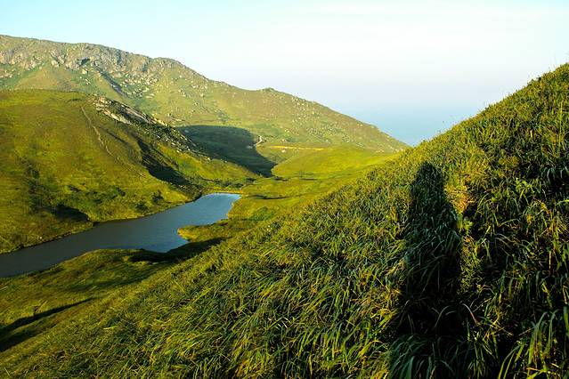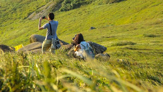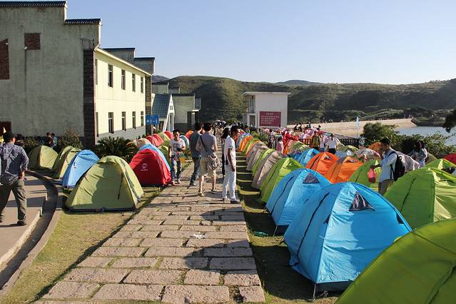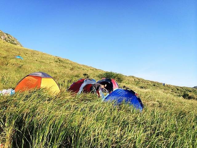 之后就收拾行李,出发去福建了,期待已久的大嵛山。国庆的高速果然不收费,我还是第一次感受,之前从来不在这在法定节假日出去玩,人挤人是最不喜欢的了。但是国庆船票和门票都是翻了倍的,船票单程50元,门票80元,上岛有巴士接送去景点,大嵛山岛是很大的,到了码头是一个小镇,镇上到景点的巴士要开20分钟的山路,然后就会看见大批的色彩斑斓的帐篷了。寻觅了一下,在正对着小天湖的半山腰“安营扎寨”了。岛上好多帐篷出租,顺带棉被,露营就是要带的东西太多了些。