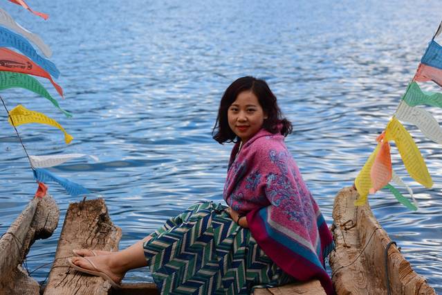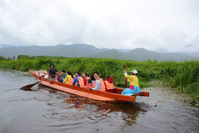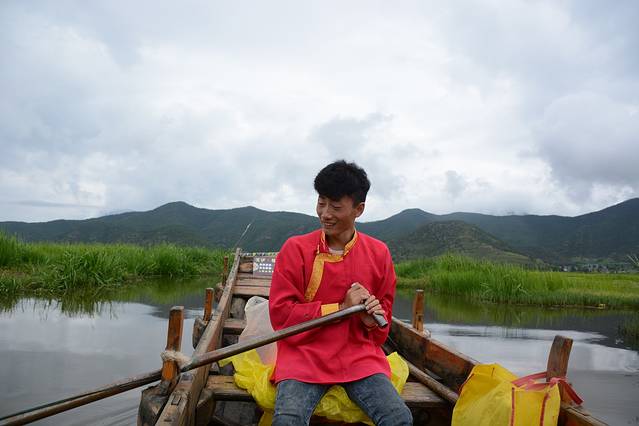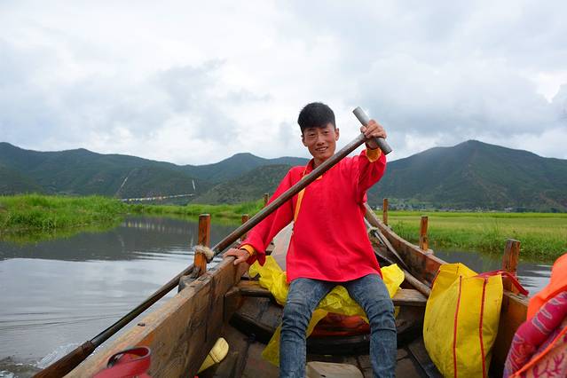 我们从洛洼码头乘坐猪槽船,70元/人,穿过草海,达到对面的王妃岛,往返一个半小时左右