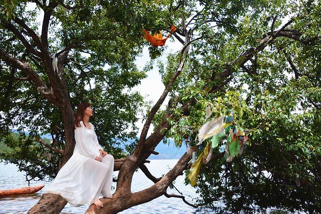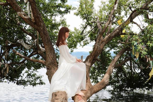 岸边有几棵千年老树,逗比如我,于是,我轻盈的爬上了这棵树~~
