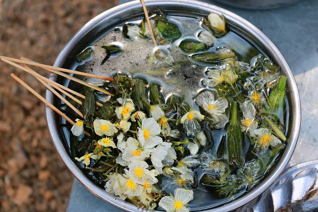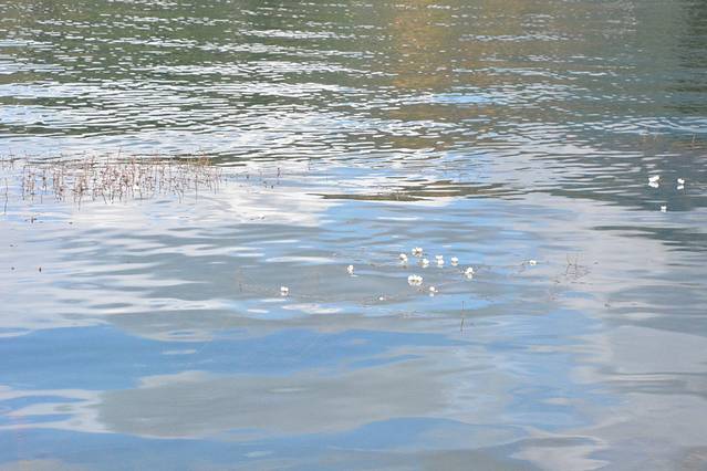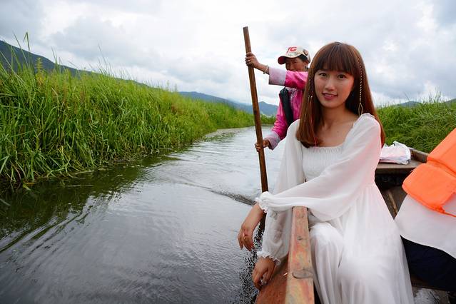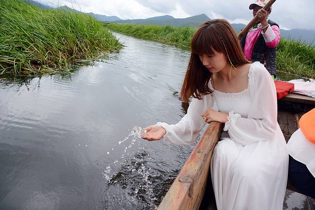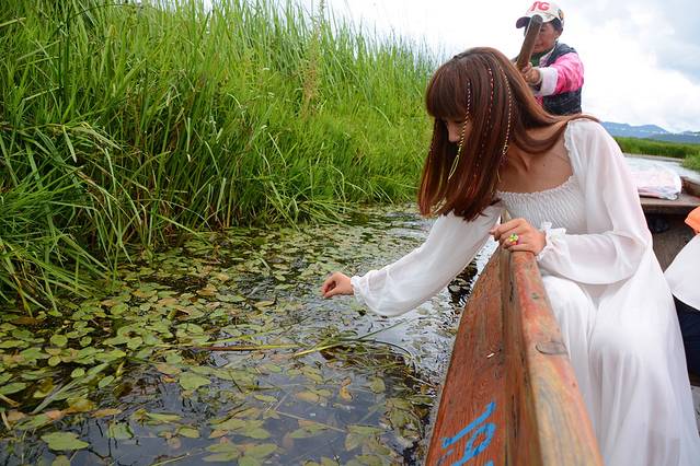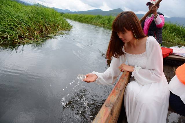 泸沽湖湖面有这样一种白色的小花名叫水性杨花,它们只有花漂浮在水面上,其他部分的全在水里。相传这种花在有阳光的时候将花露出水面,没有阳光的时候将花潜在水里,因故得名。我们去的时候雾气蒙蒙,水性杨花还躲在水里呢