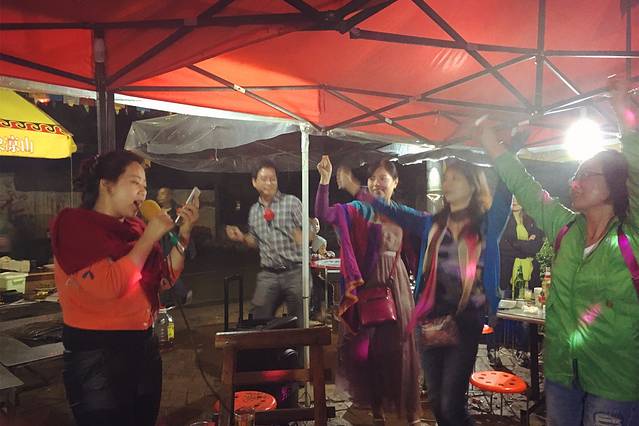 回到客栈,我们倒头就睡,一直觉睡到七点半,醒来又该开始出去寻觅美食。来到了这家很有当地特色的饭店。关键是他家的露天KTV很吸引我们,可以自己点歌自己唱。
