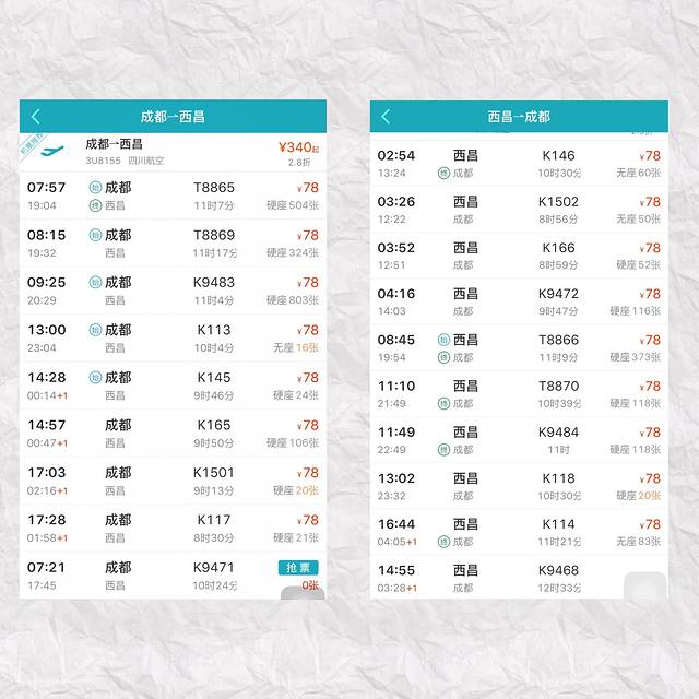 真心不想说泸沽湖有多远,去过的小伙伴都懂的,晕车的朋友请备好晕车药,成都到泸沽湖火车在山间穿行,开车速度极其慢,又经常晚点,要10小时以上,西昌到泸沽湖又要7小时的车程。当然也有飞机,但是机票很贵,不划算。我们去选的K1501,回程选的T8870,供大家参考,附赠列车时刻表: