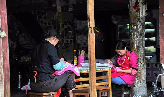 古镇里的妇女们在生意闲暇时都做起了手工活