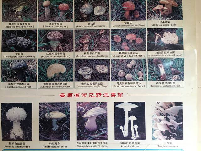南华县:南华地处楚雄西部,是全国最大的野生菌交易中心。每年雨季开始,大批大批的野生菌上市,这里的商户开始菌子的交易。即使小店里也贴上了菌子识别的图册,每年南华都有因为食用野生菌中毒挂掉的案例。所以,珍爱生命,远离毒菌