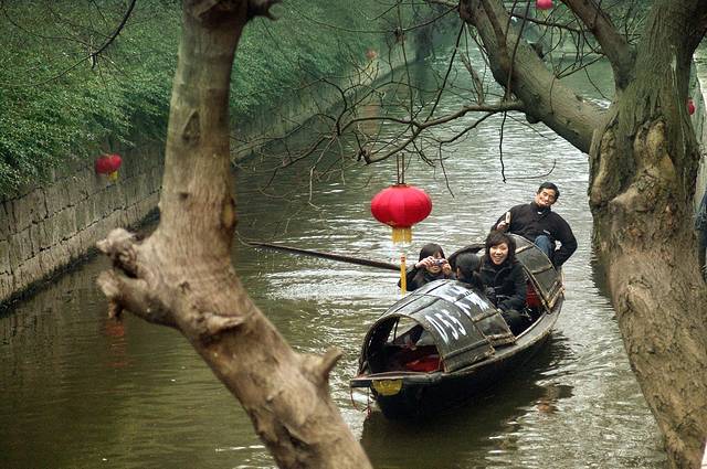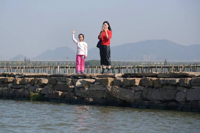 一对母女在避塘上游玩,见到游船上的我们伸出“长枪短炮”拍照,孩子友好的向我们招手,妈妈则按动手中快门。正应了卞之琳《断章》的那首诗:你站在桥上看风景,看风景的人在楼上看你。明月装饰了你的窗子,你装饰了别人的梦。