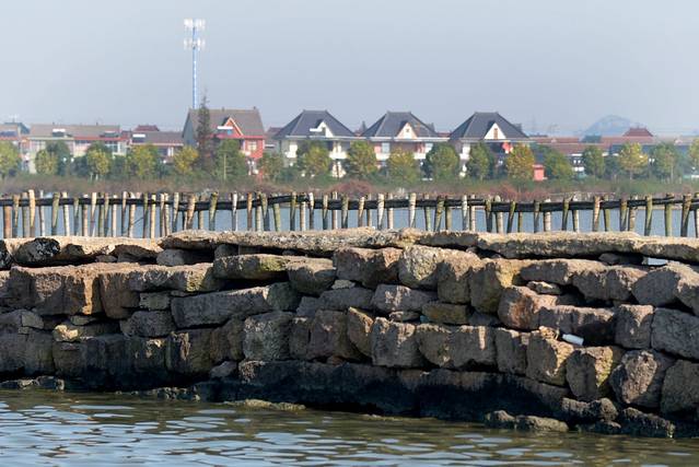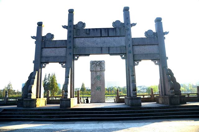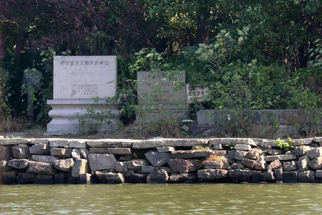 河道减宽,船行至“犭央犭茶”湖,这俩字真够偏的,读作“昂桑”。湖面出现一排石条,似桥,像道,又若堤坝。原来这就是著名的全国重点文物保护单位“避塘”。避塘横穿湖面,风起时避塘的一侧湖面有浪,另一侧无浪。船可从避塘桥进入无风一侧湖面避风。