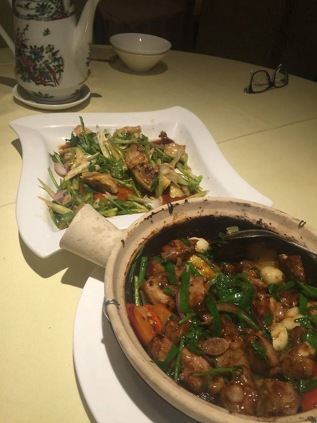 上过《舌尖2》的一家餐厅,因此特意去了,提前打电话问过三点多才歇午市,我们是2点到的,点了葱油隔夜捞鸡、啫啫排骨煲、鹧鸪煲仔饭、枸杞叶,味道虽然不错,但也没好吃上天吧