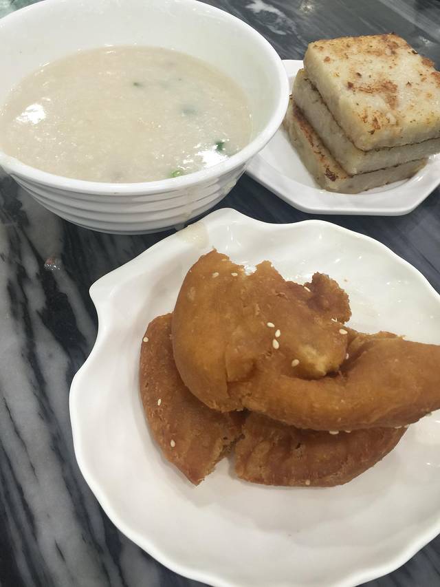 状元及第粥+咸煎饼+萝卜糕,原来状元及第粥是有内脏的、汗一个,咸煎饼泡进去好像油条的味道