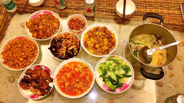 满满的一大桌子 满满的幸福感狂飙~~~外面吃的再好也不如家里随便一吃来的好! 大总管的私家鱼汤 河马足足喝了三大碗 在平时河马是不喝鱼汤的 因为她有慢性咽炎 喝多了容易喘不过气~~~今天那是例外了 吃的太嗨了 太好吃了!