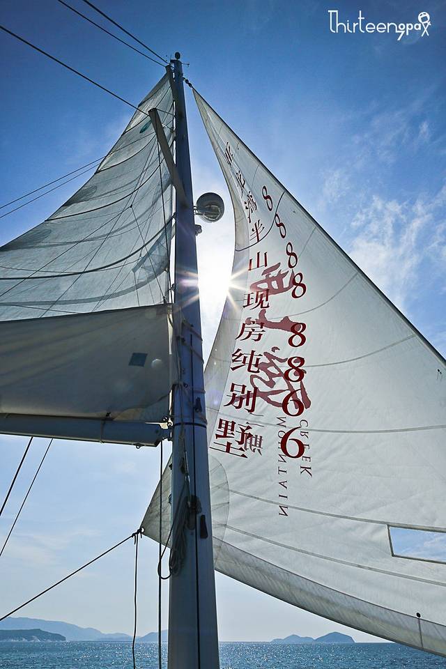 船帆上的纯别墅广告 很多人认为很眨眼~~其实这是“悦航海”的配套设施~ 在三亚的几天 不可能所有晚上都是住在船上 船上住宿只是让用户有一个新鲜的体验 毕竟这样的机会不是很多。其余的住宿都是住在“悦航海”配套的独栋高端别墅中!