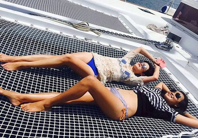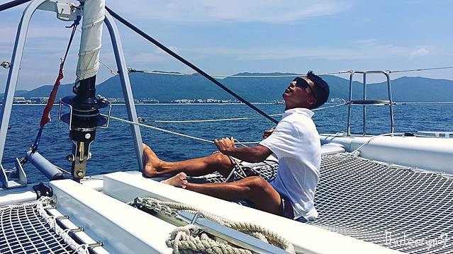 悦航海的凡尔纳号游艇前方的绷床是我最喜欢的地方 一网之隔下面就是无尽的大海~ 每天我都会在这里躺着“吃鸡蛋”(晒1个小时太阳等与吃1个鸡蛋 如果真是这样 那我会变成黑蛋吗)
