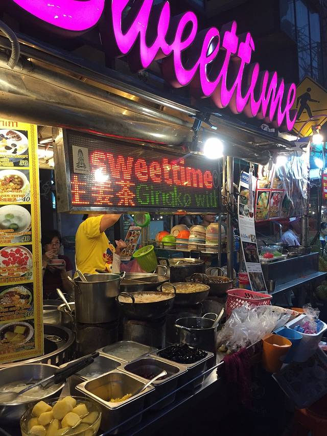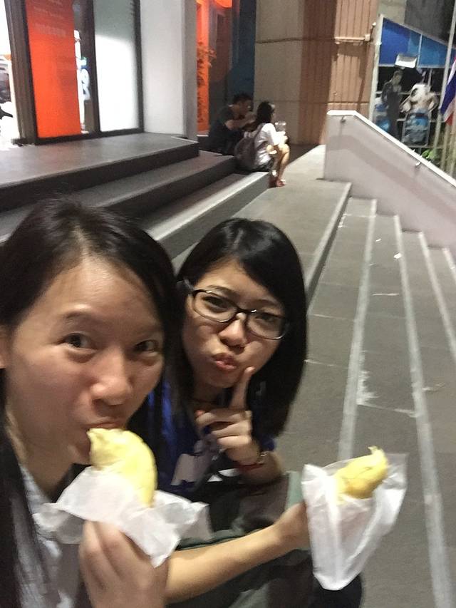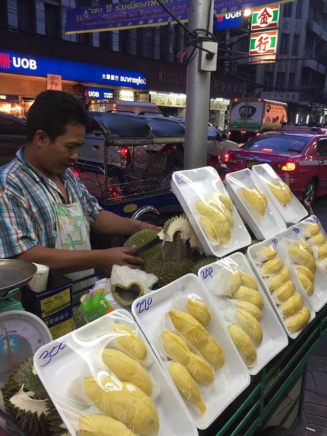 夜里的唐人街异常热闹….很多慕名而来的外国人….当然中国人也不少啦…..原以为这边开店的都是中国人….其实不然….很多都是泰国人…..有见到闻名的芒果糯米饭和泰国金枕头(榴莲)….都有买啦….不过没有糯米饭….因为觉得芒果搭饭还是有点怪….这里的物价比市区贵….吃了个小炒面之后我们便打包了整个榴莲返程咯…..不知道是拿着太张扬还是味道有点重….在地铁口就被地铁姐姐拦住了….不准带榴莲进站….没办法啦….两个人只能在地铁口坐大街即场表演吃榴莲….榴莲没有很甜,但是还不错….也觉得挺有喜感的….哈哈,好搞笑的一次经历….