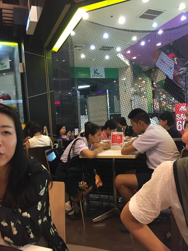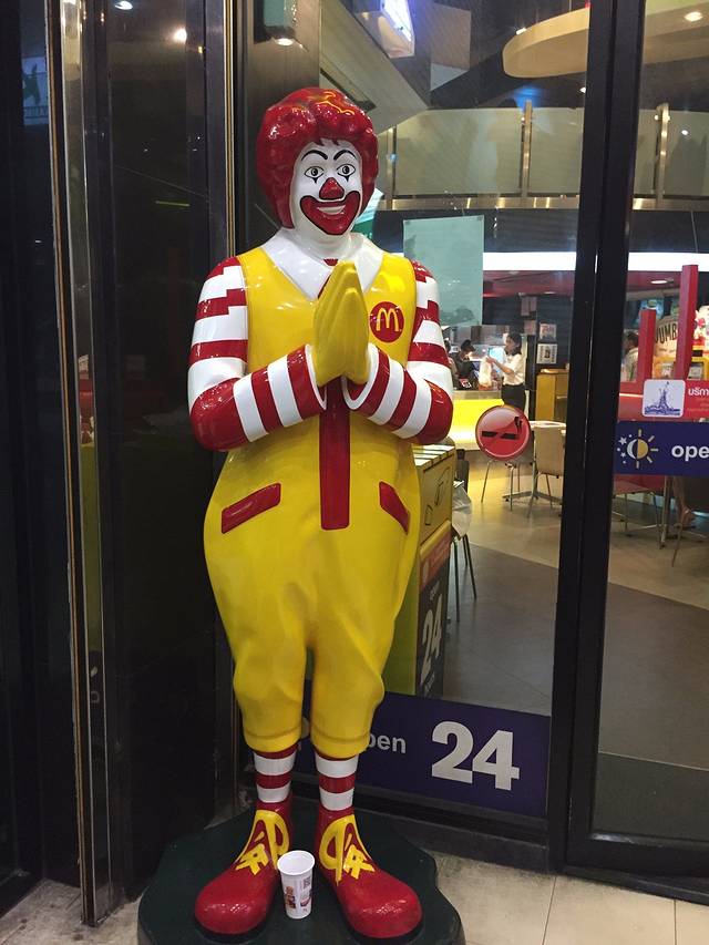 下车的地方比较近MBK购物商城….感觉还好,MBK有点像广州这边的上下九和北京路….可能经常逛的原因…..就觉得没太大感觉…..因为大雨,后面还是找了家麦当劳坐了下来….麦当劳叔叔很有爱….泰国风有木有…..点了一对JUNBO大鸡排….四个人都吃不完…..好上火又好大只…..不过味道真的很不错….旁边桌上坐着一对学生…..感觉是一对小情侣….两个人相对而坐,又彼此眼神忧郁的看了对方很久…..我们都忍不住画面代入【初恋那件小事】….嗯嗯,很有爱…..