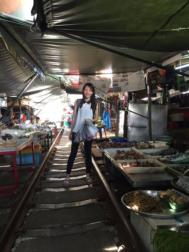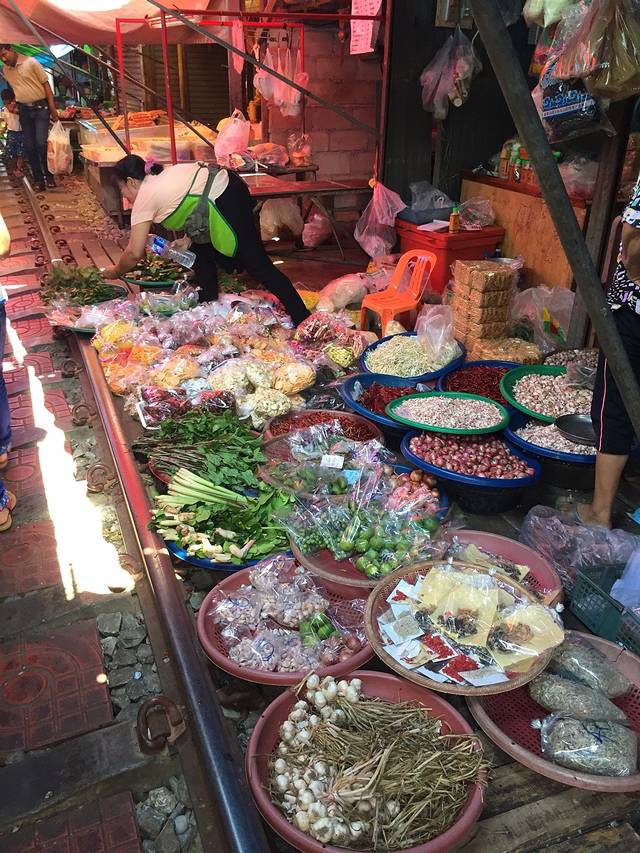 大概两个钟左右吧….我们就到了美功铁路市场…..之所以这里叫铁路市场,是因为人们喜欢在铁轨两旁摆卖各种蔬菜水果和海鲜….之前看攻略的时候说,火车一来….两旁的人们就要快速收起自己的小摊…..火车过后再重新摆上….表示我们很期待想见识一下…..其实呢,去到铁路市场会发现…..市场本身还算大,不过是有一小部分刚好与铁路接壤….而这部分的商人就习道而摆…..这段摆货品的铁路其实也不长…..道上的多数是蔬菜、水果、各种香料和冰鲜海鲜….个人感觉一般般…..沿着铁道一直走….快尽头的时候有个饮店…..好多外国人已经坐在里面了…..老板一家很热情….招呼我们坐下还告知我们火车将要经过….示意我们找好位置看火车…..确实有点赚到的感觉….十分钟之后,火车缓缓驶过…..我们这群吃瓜群众都忍不住欢呼拍照….似乎车上的人们已经习惯这种热情…..每个车上的人都挥手say hi ….画面美好…..