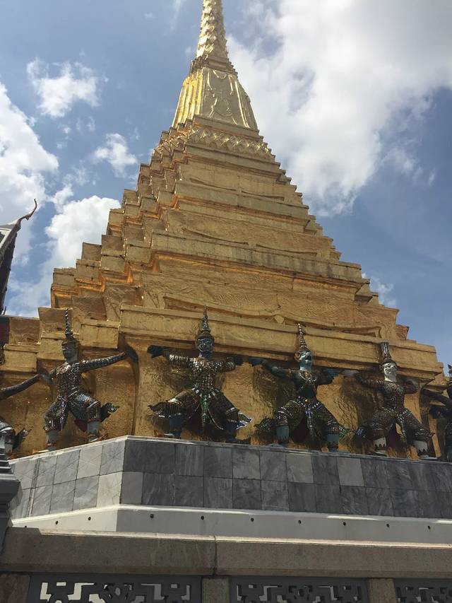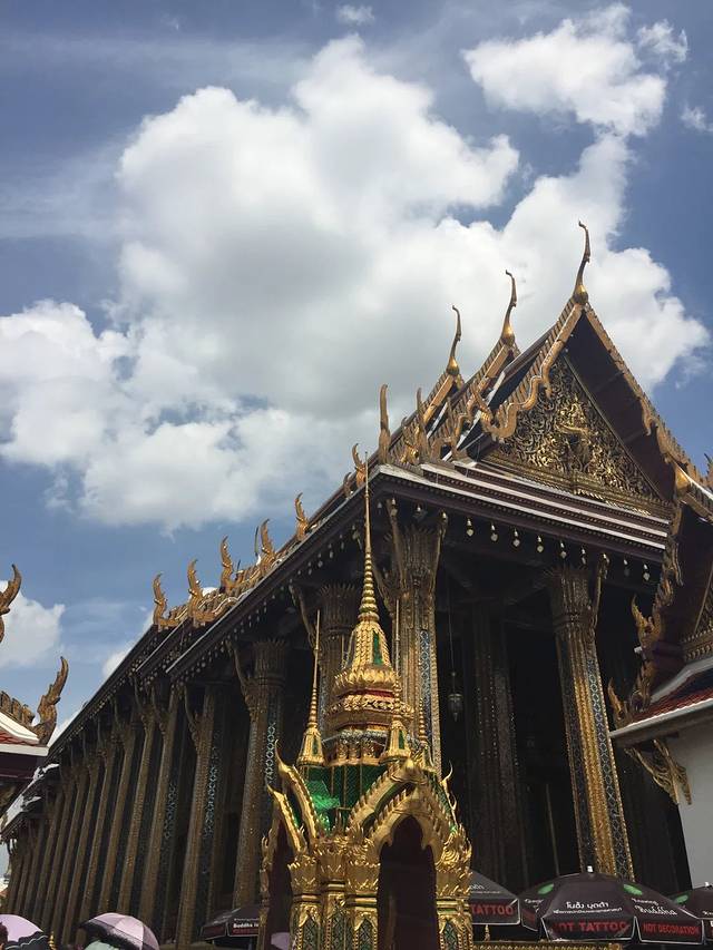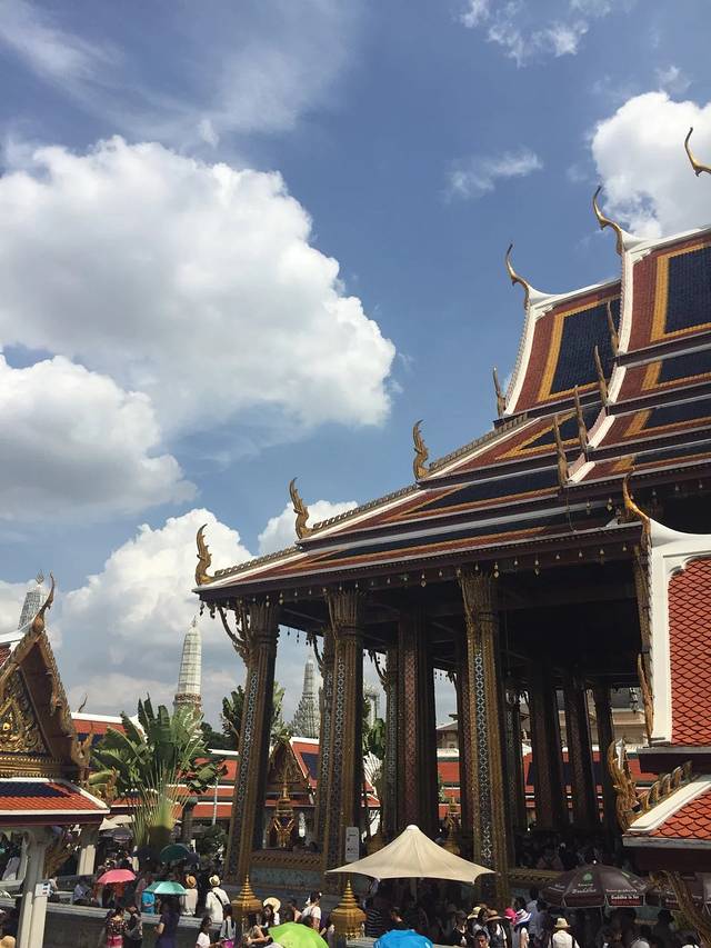 来到大皇宫,已经是下午14点….此刻曼谷的温度高达35℃…..暴晒疲惫的情况下再看到眼前Tons of people…..瞬间有点不想进去….在门口买的联票,每人500泰铢….捆绑3个景点…..进到大皇宫,还是有给它的辉煌壮观震撼到…..到处都是金碧辉煌的一片…..各种壁画和巨型神像…..因为没有导游的原因,我们一行四人都只是在外围逛了一圈…..有点懵…..也找不到进寺庙的入口….真的很热很累又很口渴…..就是这样很随便的逛了一下就走出了大皇宫的出口….其实我们都不知道那是出口,只是跟着大家走….当我们回过神来想往回走时,已经被出口的工作人员拦截在外…..后面听说逛大皇宫是不能往回走的….好吧,我们也走不动了…..