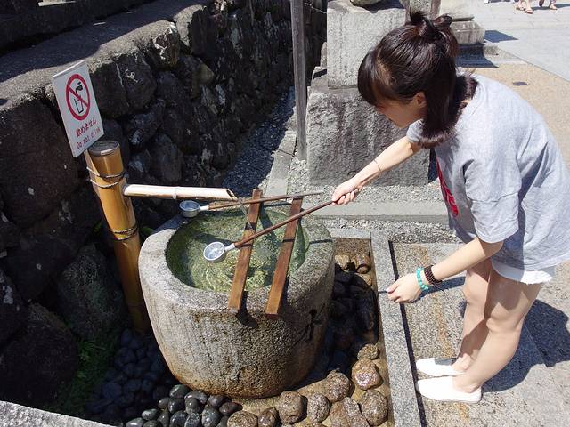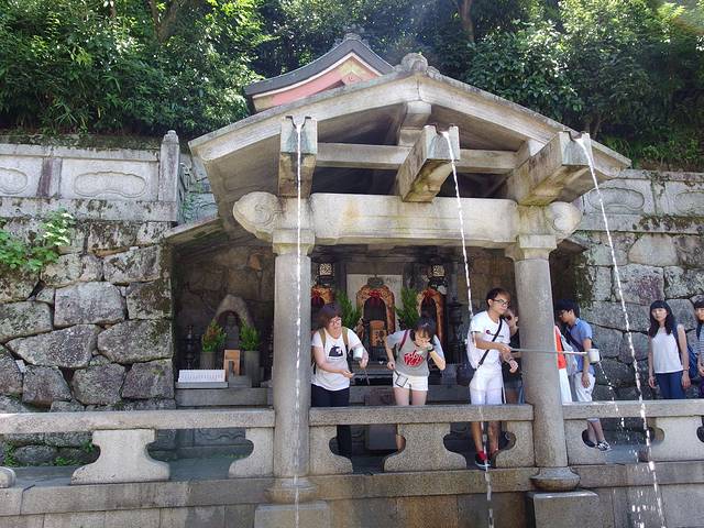 清水寺因寺中清水而得名,顺着奥院的石阶而下便是音羽瀑布,清泉一分为三,分别代表长寿、健康、智慧,被视为具有神奇力量,据说喝上一口水可预防疾病及灾厄。