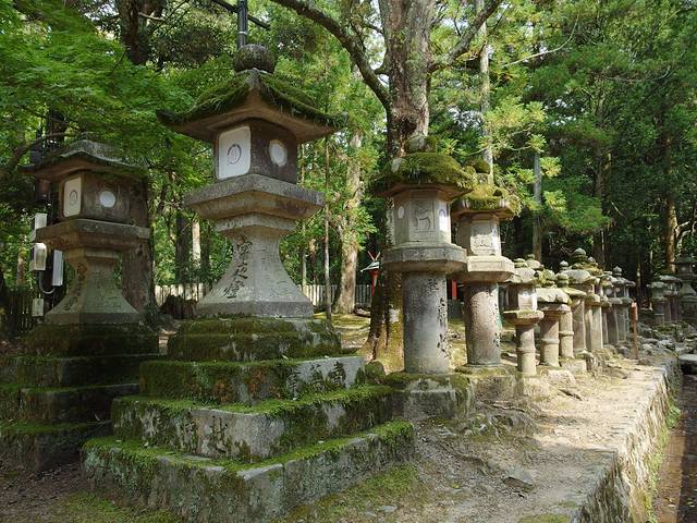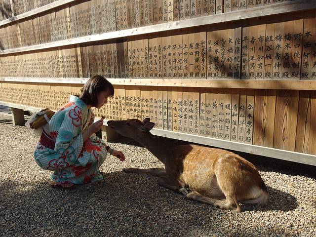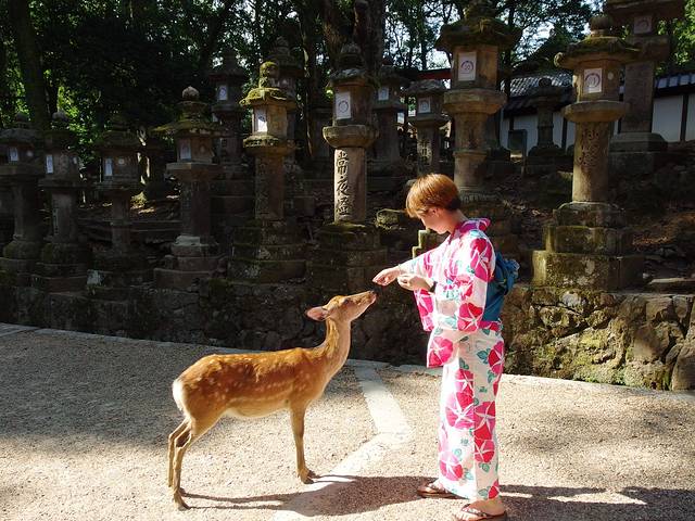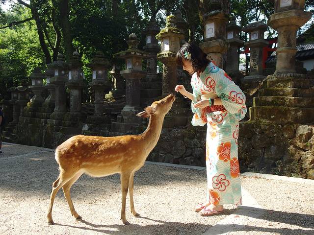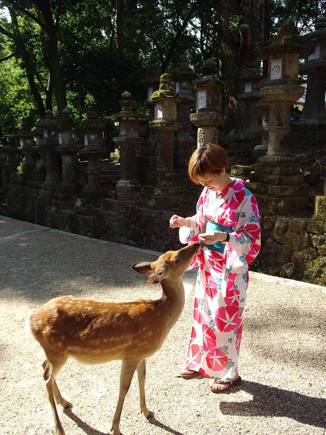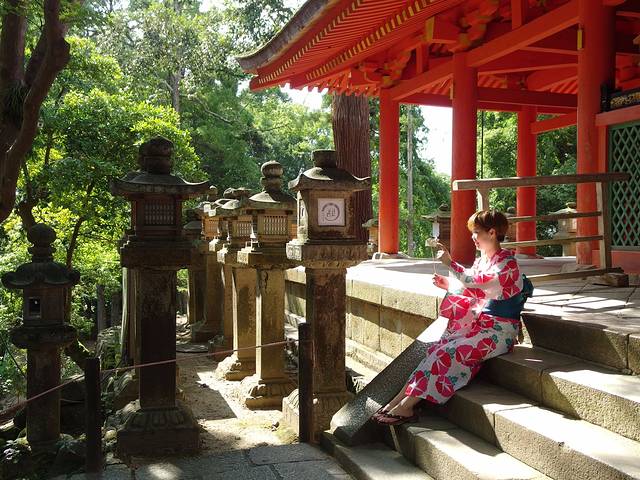 日本,弹丸之地,但是奈良公园还是蛮大的,走过公园到春日大社,一路上不太有穿浴衣和和服的人,所以,我们俩一直被路人邀请拍照。。。