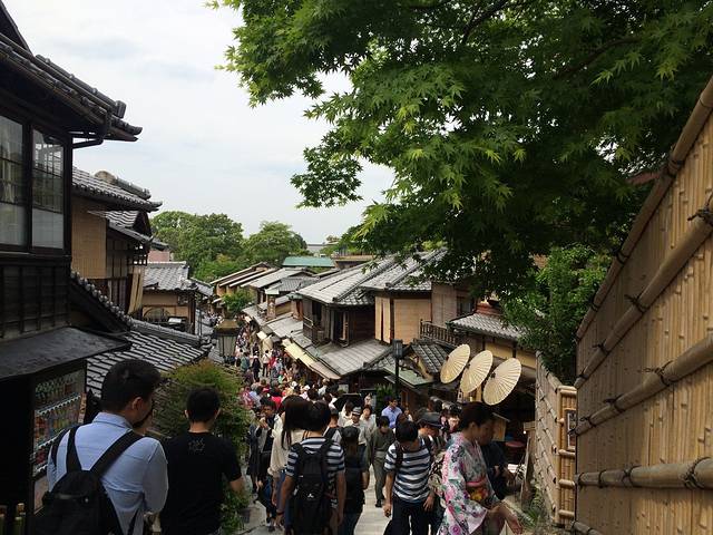 喝完泉水,我们就沿步道走往出口,清水寺的行程也基本就结束了,出了清水寺,下山路上就会经过三年板、二年板,其实就是日式街道,然后各种小店,我们买了八板桥(糯米的糕点)、还有抹茶的蛋卷。