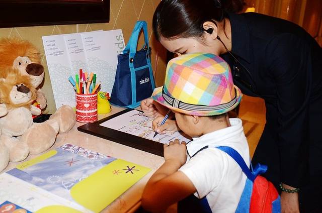 探索之旅从登记入住起开始:笑容可掬的姐姐正在耐心地为儿子在专属柜台处办理check-in.