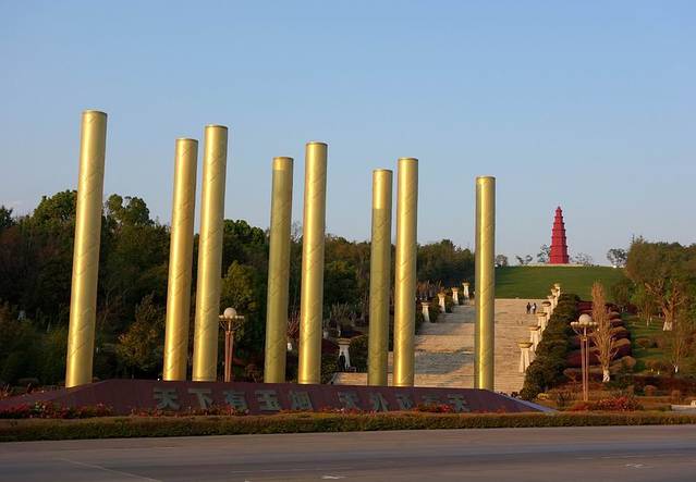 红塔山公园前的一排黄色的巨型香烟很醒目,一行大字“天下有玉烟,天外还有天”告诉人们,这里就是玉烟(云烟)的发源地。