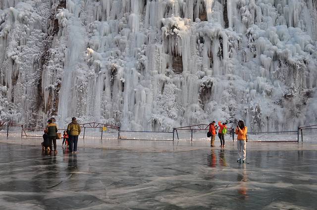 询问当地要工作人员:正月初六不能上冰面了,建议明年再去了,一般每年的1月1日开始开放,看天气的冷热程度冰面情况而定关闭,上午8点开门,晚上9点关门。票价45元,学生半价。包括冰瀑,冰上滑车,栈道,爬山,晚上观彩灯,内有农家乐可以吃住的。