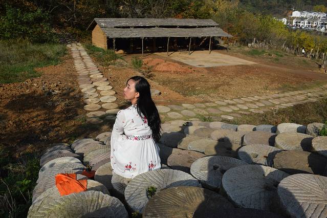 步入银杏谷,一条独具风格的步道映入眼帘——完全由石磨并排铺装而成的“石来运转”步游道,一直从五老树广场延绵至景区深处,据说这多达五百万块的石磨是由全国十几个省,几百万户人家自愿捐献而来的。