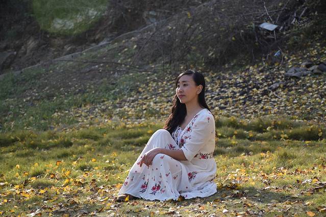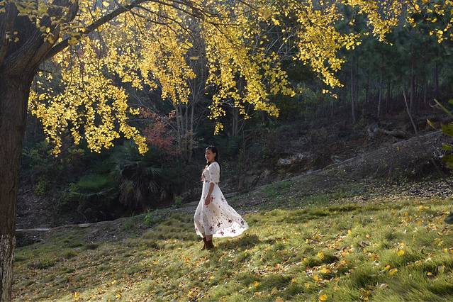 着一袭长裙行走在银杏国度里,秋风舞罢,落叶缤纷,金色的叶子摩挲着随风飘起的裙角跌落而下,然后又被游人的鞋尖轻轻的踢起,片片金色就这样不停的在地面跳跃,每片叶子都留下了一个故事。