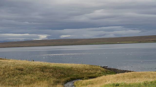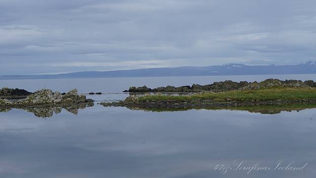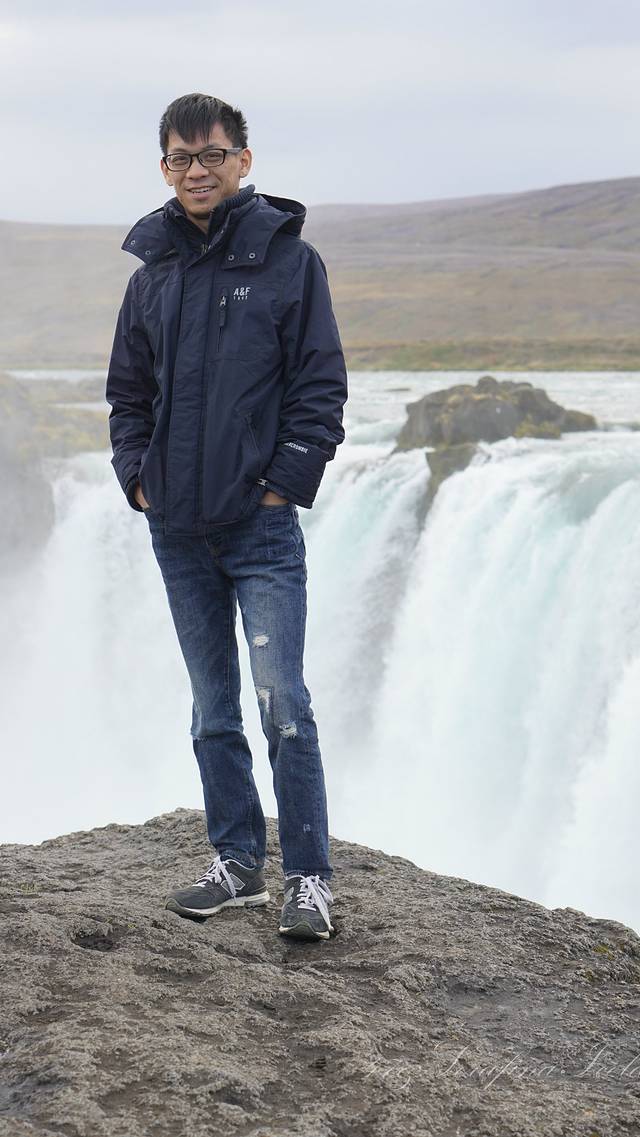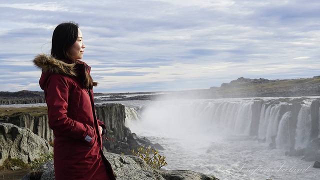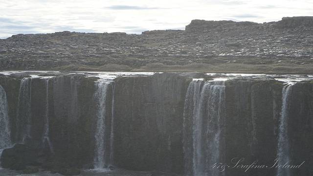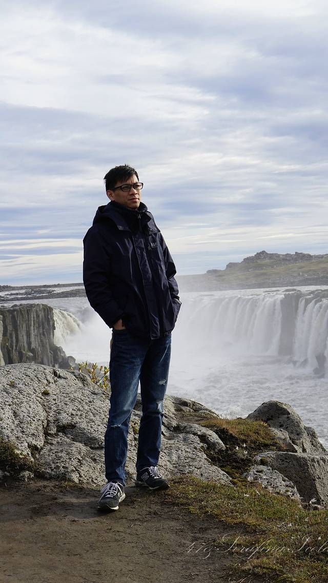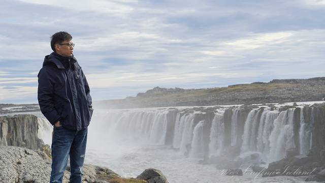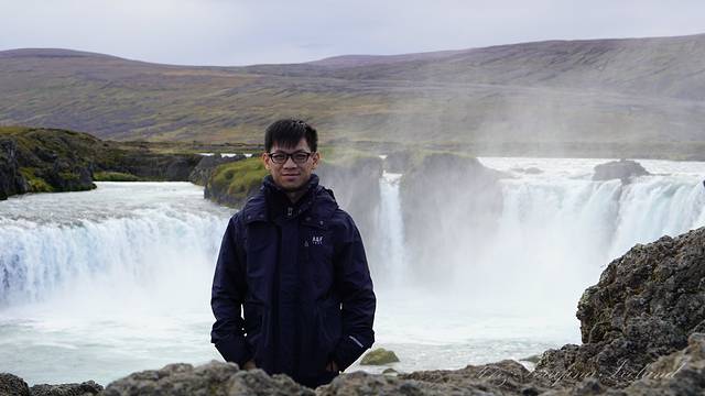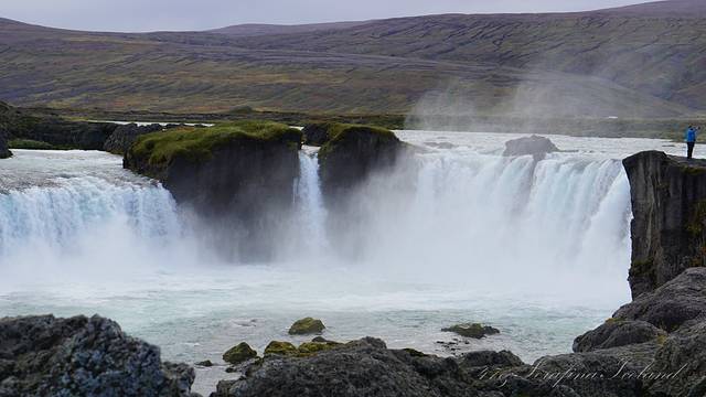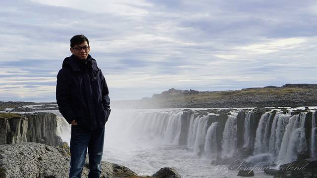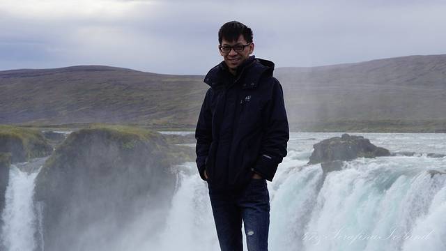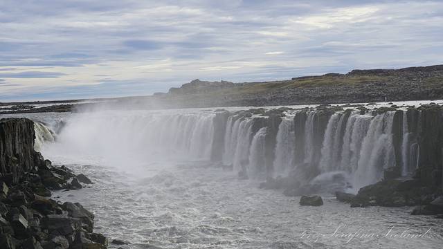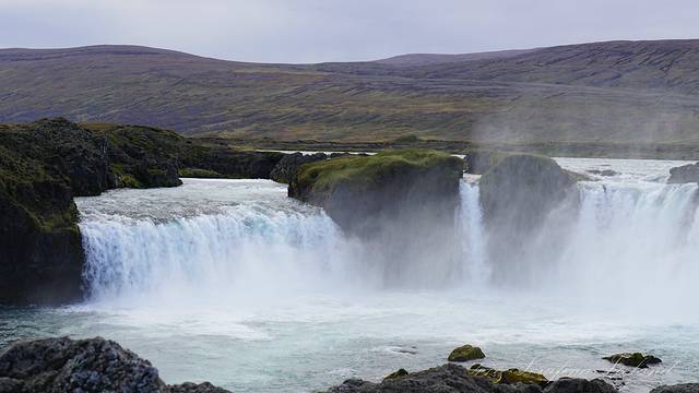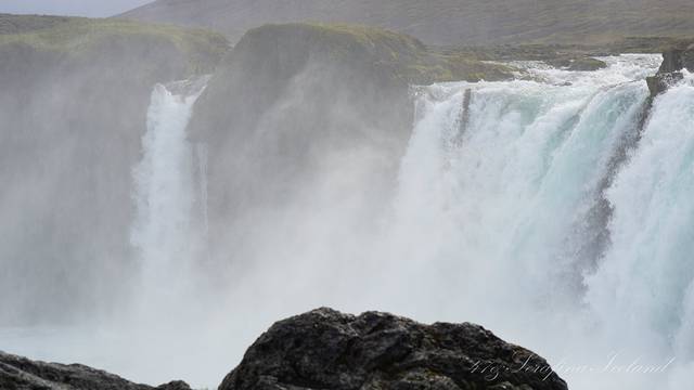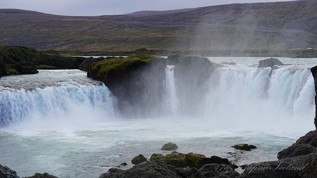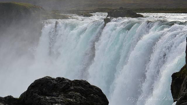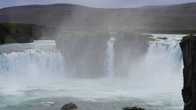 我们一路向西开往今天住所,路上遇到最后一个瀑布——Godafoss。高斯达瀑布水色淡绿,整体为马蹄形,约高12公尺宽30公尺,落差12米,水量很大。它是左右各有一扇宽瀑布,基本是对称的,而在对称的中轴线上还有一条独立小瀑布。不远处还有两道一宽一窄的水流,使得整个瀑布群很有层次感,立体感很强。瀑布两岸都有观景台,有一侧在水不高的时候还可以下到河滩去;另一侧的则可以绕到它上游观看水势,这个景点绝对值得一游。