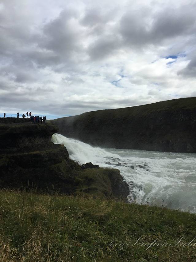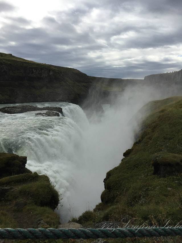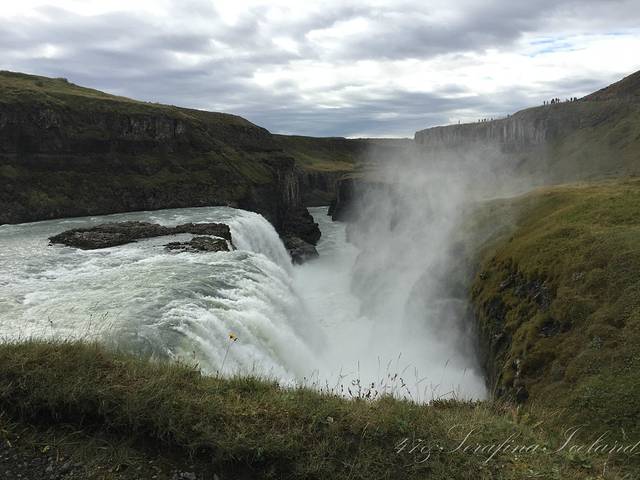 黄金瀑布即Gullfoss,在哥吉尔喷泉北面十公里处,是冰岛人最喜爱的瀑布,也是欧洲著名的瀑布之一,倾泻而下的瀑布溅出的水珠弥漫在天空,在阳光照射下形成道道彩虹,仿佛整个瀑布是用金子锻造成的,景象瑰丽无比,令游客流连忘返。