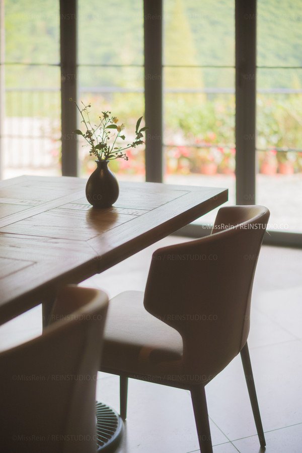 餐厅由几张桌椅,大大的落地窗,mini卡拉ok台和放餐具的五斗橱组成。各种质感的对比,加强了建筑的风格化,然而整个环境依旧给人柔和亲切之感。