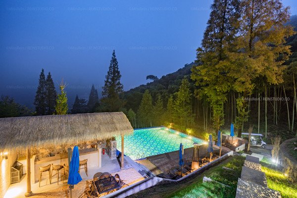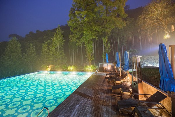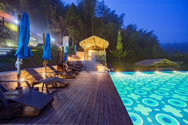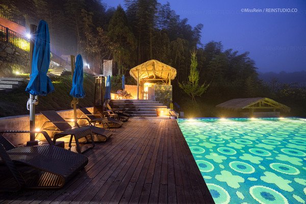 游泳在夜色灯光中,像一块四四方方的蓝宝石,池水清澈,花纹规则,好像生来嵌在山坡上,而不是后天堆造而成。白天在阳光下泛着光泽,入夜后灯光使得这池秋波好像不眠不休。来这里游一场青山绿水,浸一身花香竹韵。