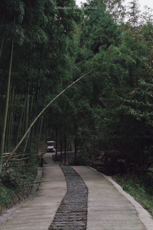 不一会儿,一辆Golf车出现在眼前,带着我们轻松穿入竹林,朝着上坡驶去。