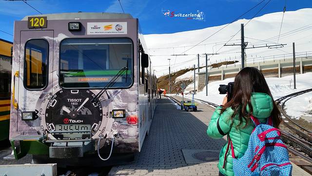 坐上去往少女峰的登山火车。我们先上了列车,过了一会从Grindelwald的车也来了,下来很多人,车上很快又有人站着了。列车会经过一个很长的隧道,庆幸我们是坐着的。