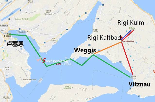 绿色线就是从卢塞恩开始的游船路线。红线是从Viznau至Rigi山顶的登山火车路线。下山时在Rigi Kaltbad下车,并转乘缆车,缆车是橘黄线到Weggis。之后在Weggis乘船返回卢塞恩。