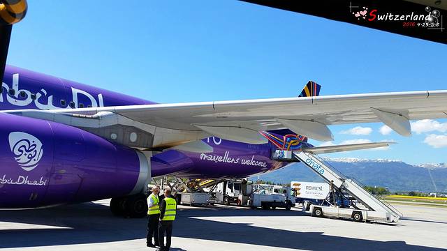 座位在预定时候就可以选好,当然选靠窗户的最好啦!因为阿提哈德航空A330经济舱座位都是2-4-2排布,靠窗户完全不会被打扰。而且可以快要抵达日内瓦的时候可以尽情欣赏美景,雪山景色及其壮观!这时候航班机长骄傲的提醒大家观看欧洲最高峰勃朗峰哈哈(机长好可爱)。机舱内快门声不断。坐在中间位置一个阿拉伯人特意把手机拿给我,让我帮她拍照。我以极其负责任的态度帮她拍了好几张哈哈。从苏黎世回来的景色就没有日内瓦附近的好,虽然也有雪山湖泊,但是略逊一筹。不过好在苏黎世回来是波音787-9值机,飞机窗口不是手动下拉式的遮光板,而是阴暗可以调节的透明窗户,好牛逼的样子!