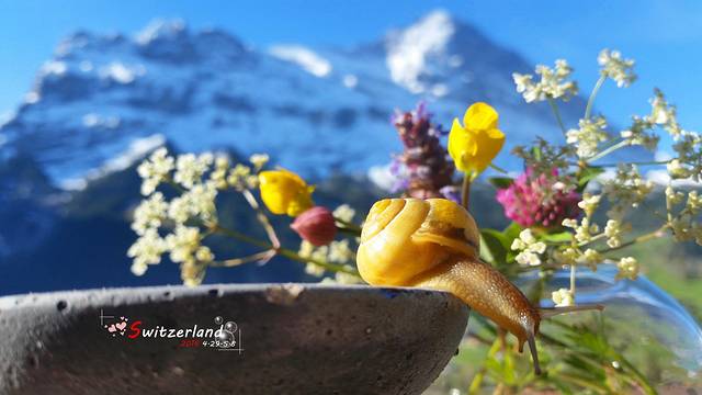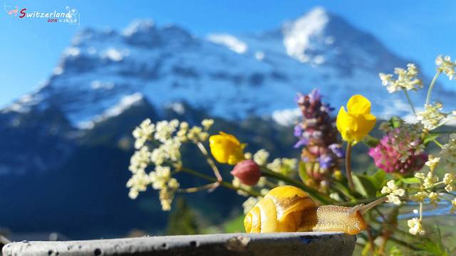 为什么要拍一个小时呢?因为蜗牛实在是太胆小了,一有风吹草动,马上就把头缩到壳里去了然后又要等好久,才能探头出来走。蜗牛走起来真是慢啊,要耐心等到他们走到合适的拍摄位置和角度,拍起来十分辛苦不过拍出蜗牛与艾格峰、鲜花的合影,1个小时也值了。反正要等豆豆起床