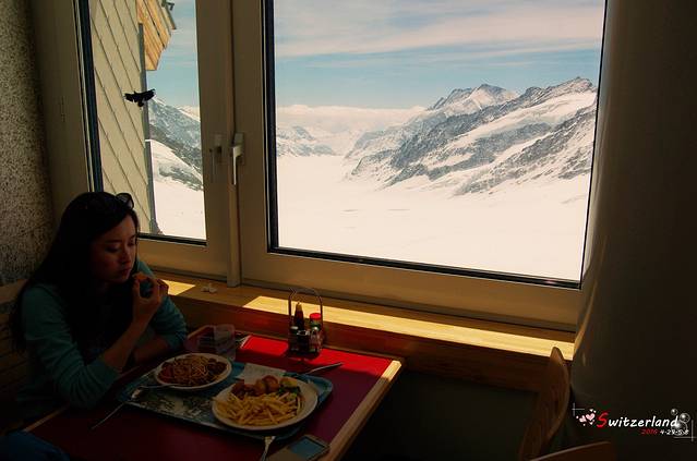来到Jungfraujoch已经中午了,在少女峰餐厅里吃午饭。窗外就是阿莱奇冰川美景。