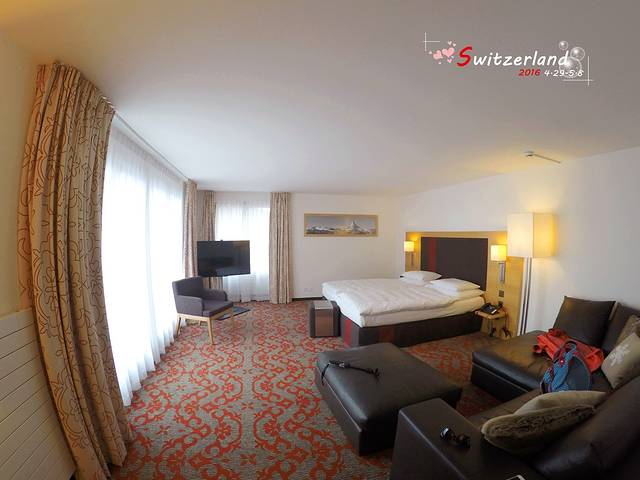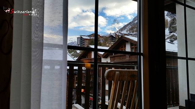 采尔马特2晚,hotel garni testa grigia,在booking上订的是一晚。有高级双人间和豪华双人间两种选择,两者只相差60元人民币,面积一个是27平,一个是45平。差价这么少,果断选择豪华双人间啊!booking上给出的一晚价格是195CHF,包含早餐。入住酒店的当天下着大雪,看这情况一想,当天看到马特洪峰的希望是不大了,和老板商谈加一晚,法国老头给出第二晚180CHF的优惠价格。所以两晚价格是375CHF,含城市税。看来每晚让booking赚了15CHF啊。这个酒店相当不错,豪华双人间有一个大露台,可以看到马特洪峰山尖。落地窗很爽,在屋子里可以一边看电视一边欣赏马特洪峰,电视也很大!早餐还不错,有三文鱼和方便面,餐厅实时播放观景台气象信息。不愧是booking评分9.2的住宿,强烈推荐!