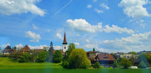 来到利玛特河边,眼前的景象让人不敢相信:这还是我们昨天看到的利马特河吗?河水平静地映出来的倒影,让我们以为是在江南水乡。
