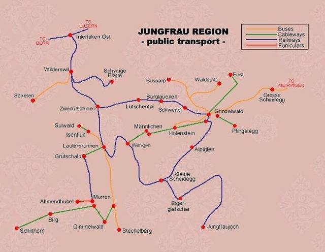 图来源于网络,是很经典的少女峰周边公共交通路线图。黄线表示公交,绿线是缆车,蓝线是铁路火车。而雪朗峰(Schilthorn)就在少女峰(Jungfrau)西侧,上午拍少女峰是逆光哦。