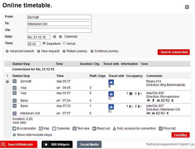 金色山口列车不需要预定座位,但是如果想看到好的景色,可以选择预定座位,或者找人少的时间段(比如九点之前的车次)。在SBB网站上查车次时,看一下Occupancy显示有几个小黑人:三个小黑人表示非常拥挤,两个小黑人表示比较拥挤,尽量不要选择这种车次,如图。