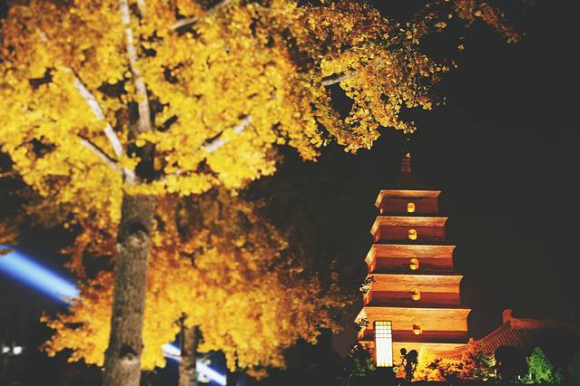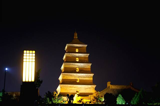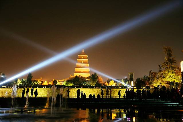 大雁塔又称“慈恩寺塔”,位于西安市南郊大慈恩寺内,建于公元652年,第一任主持是众所周知的玄奘大师唐三藏。传说玄奘为了保存经九九八十一难才得到的天竺真经,特地设计建成了这座塔。晚上的大慈恩寺下班了,只能远观不能亵玩。