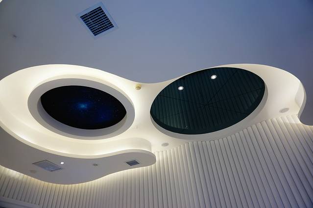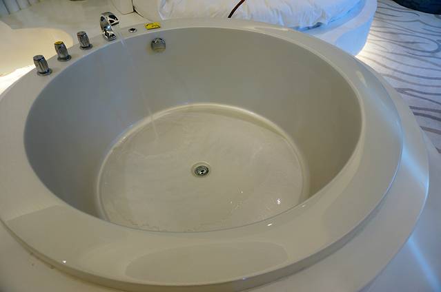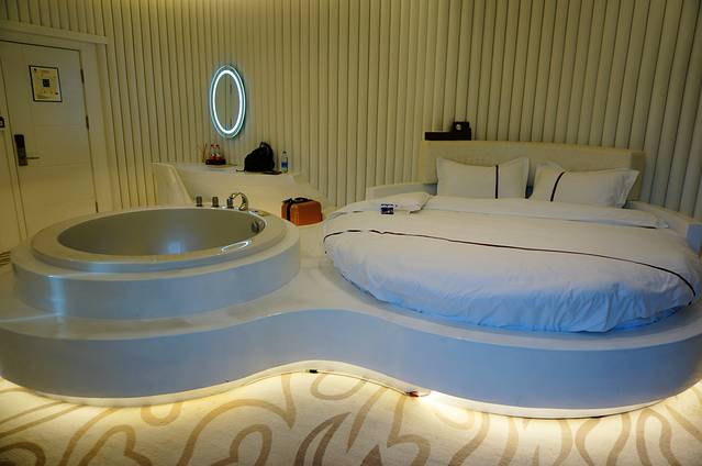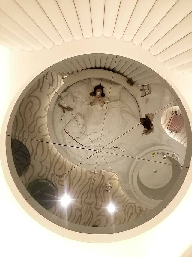 床和浴缸顶上也分别有两个圆形是设计,第一个就是星空,浴缸对上。第二个是一块镜子,有木有睡公主的感觉~!